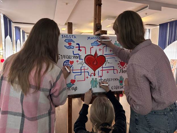 Во время выступления с монологами о донорстве студентов направления подготовки: «Юриспруденция», на ватмане были записаны качества, присущие донорам. Затем присутствующие в зале выходили на сцену и также добавляли свои идеи. За совпадающие слова, участники получали в качестве поощрения вкусный подарок — гемотоген.