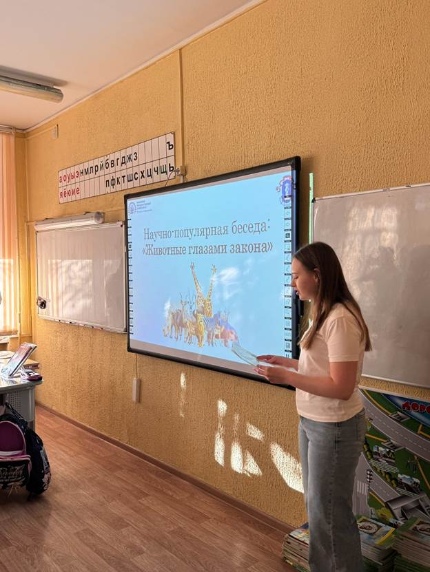 Школьникам рассказали о животных как объектах гражданских прав, а также о правах и обязанностях их владельцев. Для ребят был проведен интерактив, в котором им нужно было ответить на 5 вопросов. Все ребята отлично выполнили задания!