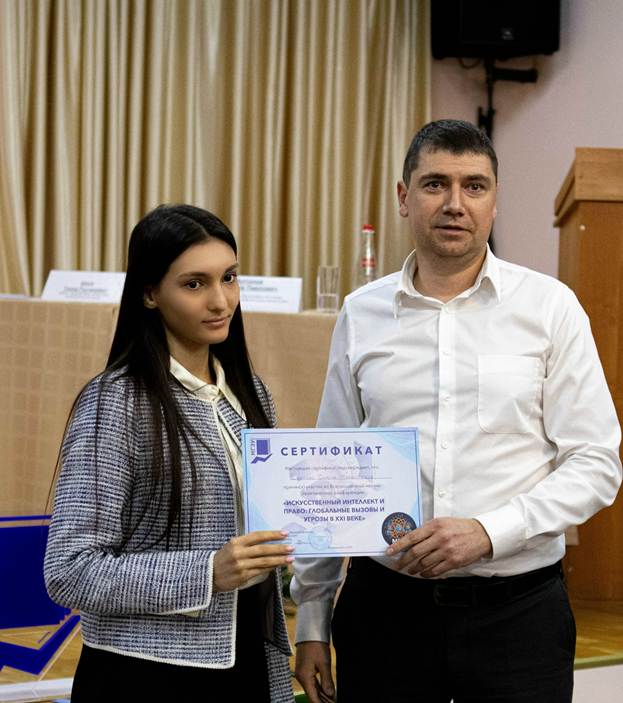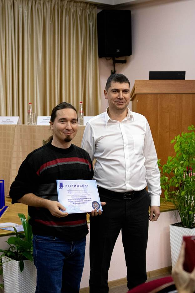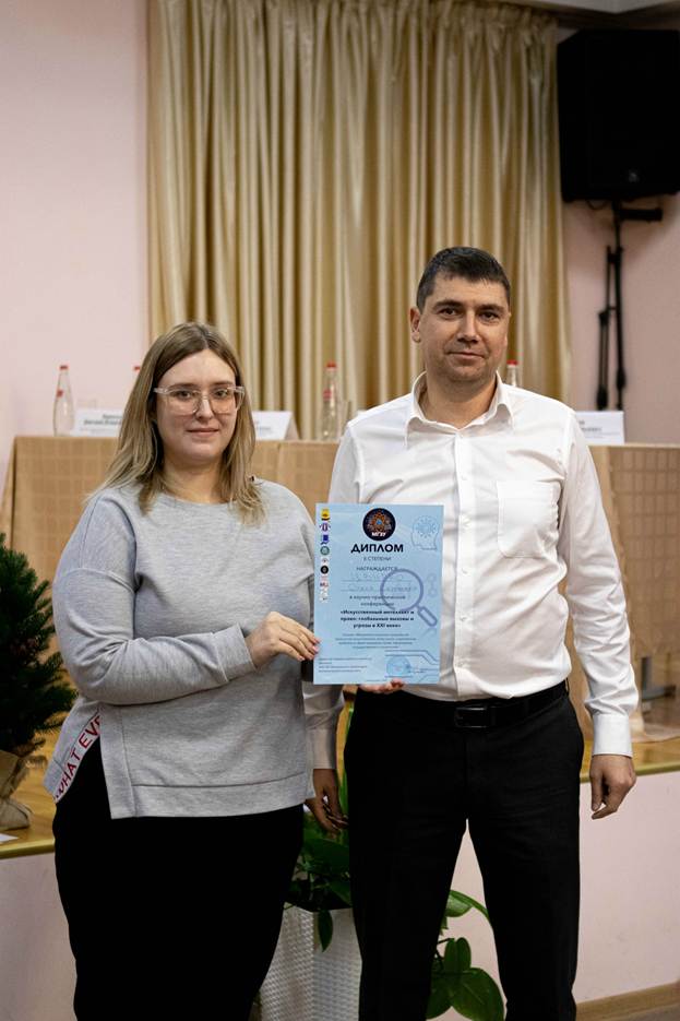 Цвирко Олеся Сергеевна, студентка 4 курса , занявшая 2 место Сопильняк Эдуард Александрович, студент 4 курса - правовые аспекты ответственности за действия искусственного интеллекта (научный руководитель: Телегина Елена Геннадьевна). Данилко София Максимовна, студентка 2 курса – «Правовое регулирование вопросов транспортного контроля и безопасности в условиях интеграции искусственного интеллекта в систему городского управления» (научный руководитель: Телегина Елена Геннадьевна). Исаев Константин Рэмович, студент 5 курса – «Развитие сетей 5G в Российской Федерации: проблемы: от частоты до микросхем» (научный руководитель: Холевчук Артур Георгиевич).